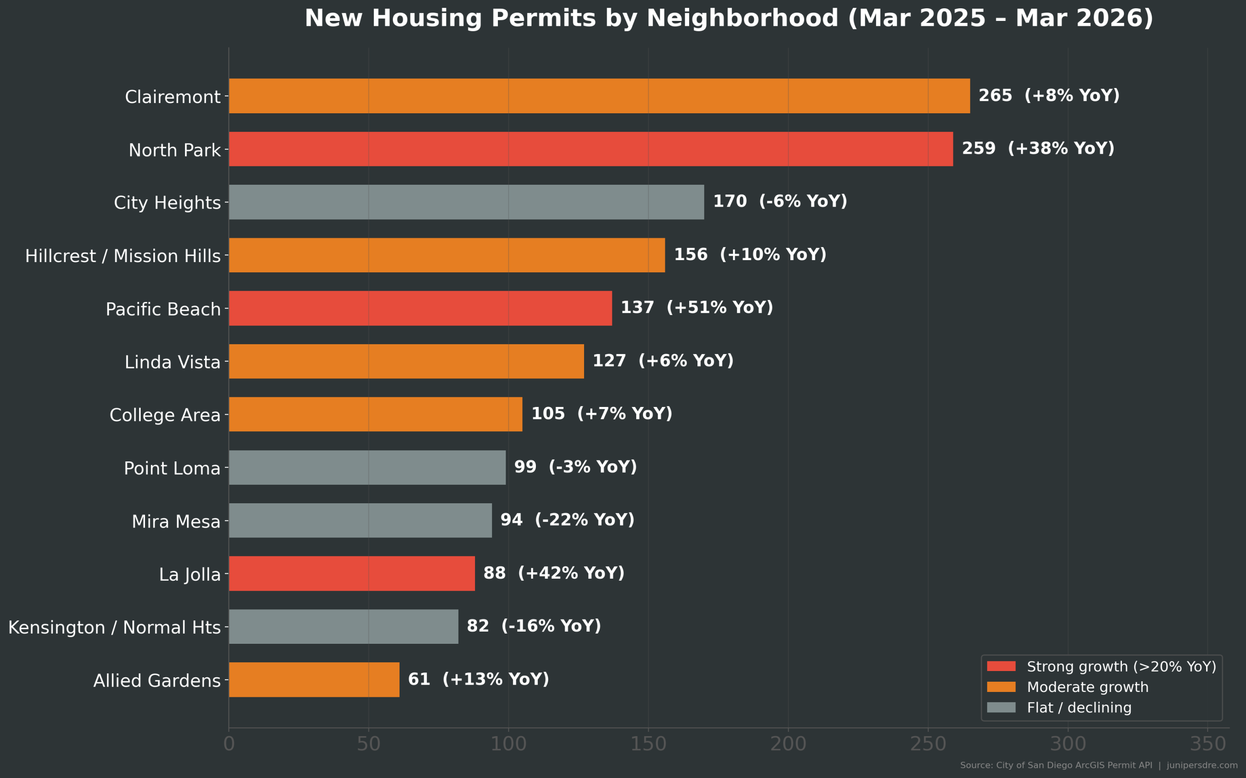 Based on building permit data and market trends, North Park, Linda Vista, Pacific Beach, and College Area show the strongest development momentum heading into 2026. North Park alone has 255 new housing permits, up 37.8% year over year.