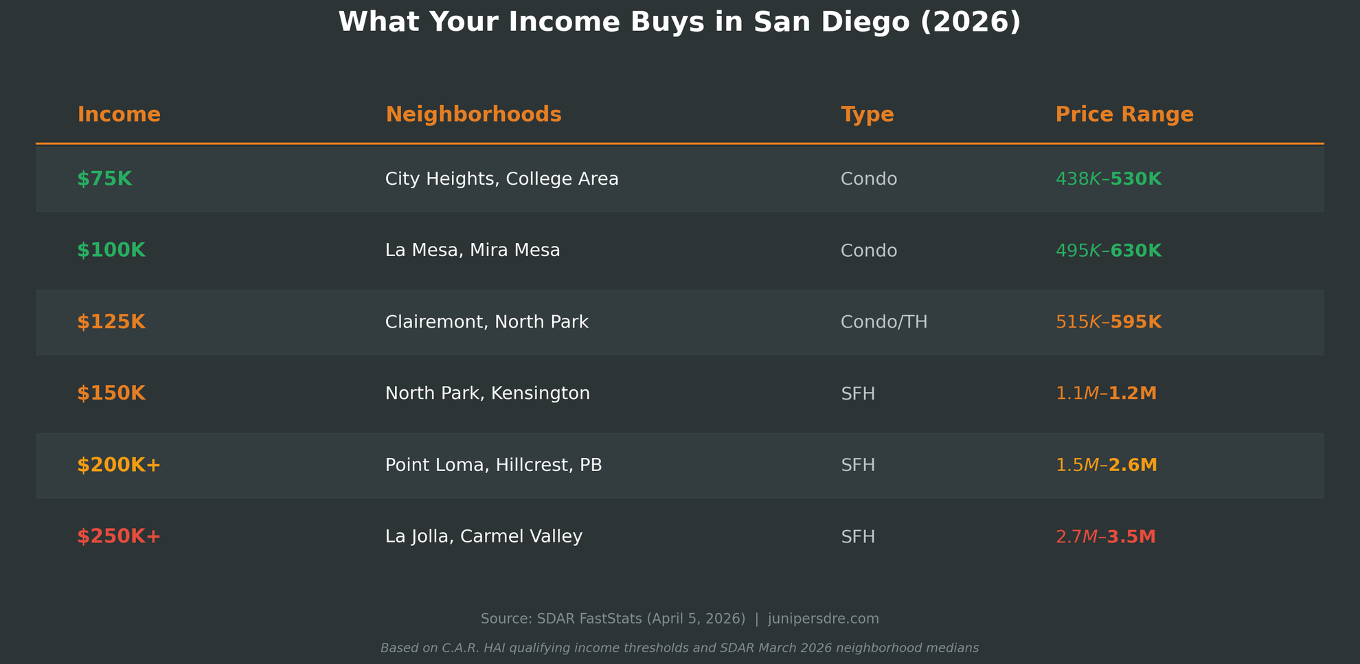 It depends on your household size. For a single person, $100,000 puts you in the moderate comfort range, but homeownership is a stretch. The median San Diego home requires $243,600 per year to qualify for a mortgage. At $100K, condos in City Heights ($530,000) or Mira Mesa ($630,000) are more realistic targets. The median wage in San Diego County is $88,500, so $100K puts you above the midpoint.