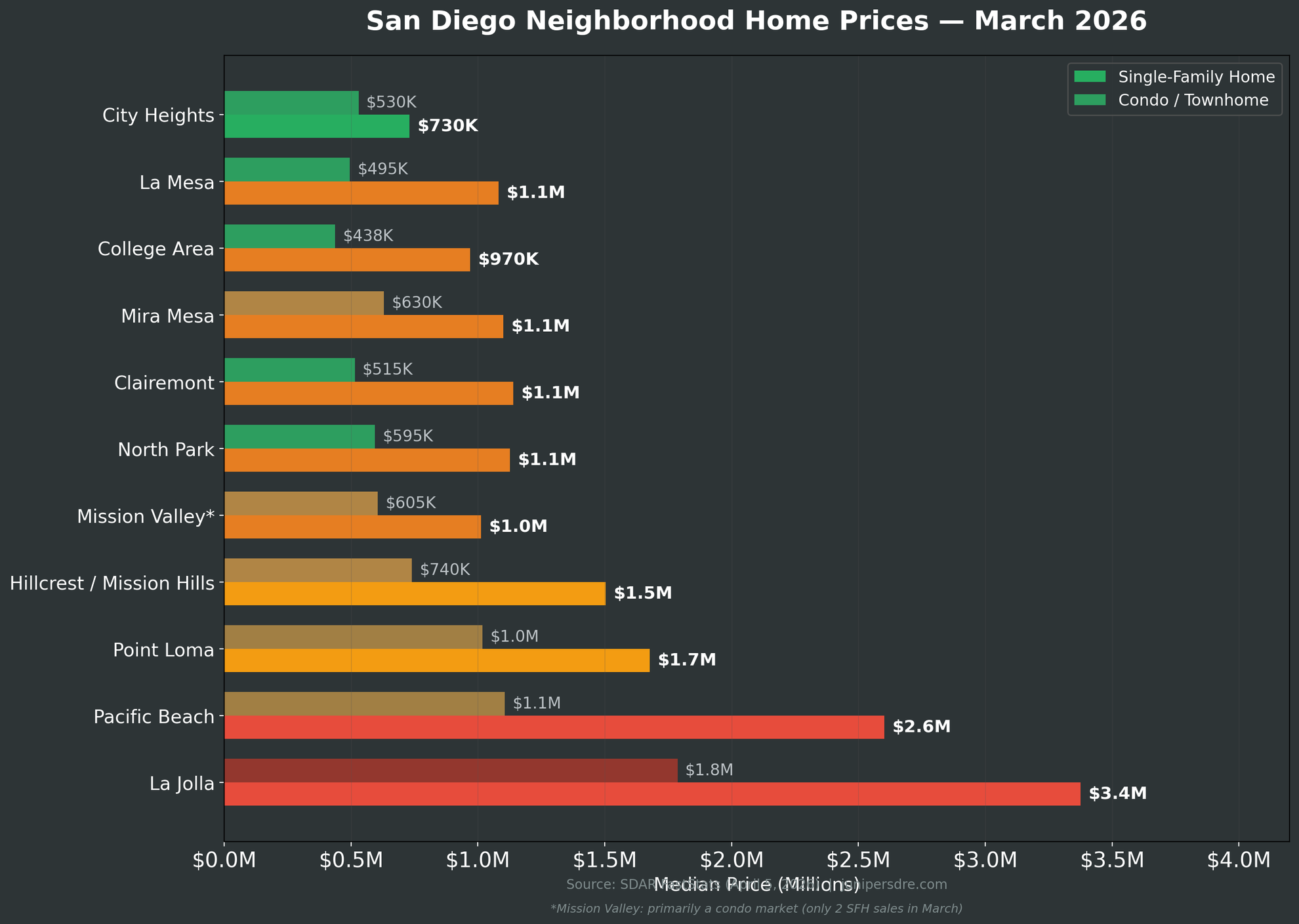 City Heights ($730,000 SFH median, $530,000 condo) is the most affordable entry point inside the city of San Diego. It is diverse, improving rapidly, and about 20 minutes from downtown. Condos here start in the $400,000s. La Mesa ($1,082,500 SFH, $495,000 condo) is technically outside the city limits but feels like a San Diego neighborhood. The walkable village center, strong schools including Helix Charter High (rated 10/10 on GreatSchools), and more space for the money make it popular with families. The College Area ($970,000 SFH, $438,000 condo) around San Diego State University offers investment potential and some of the most affordable condos in the county.